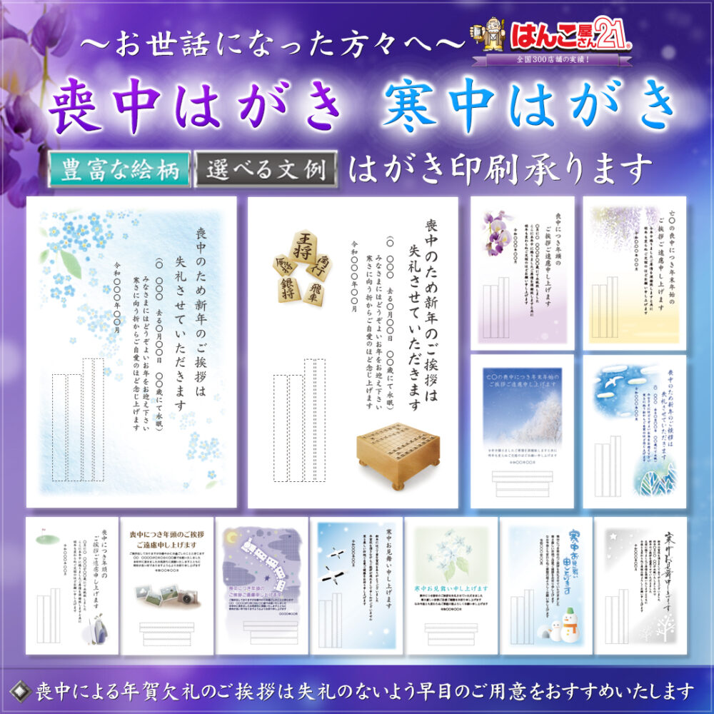 はんこ屋さん21の喪中・寒中見舞いはがき印刷では、絵柄と文例を自由に組み合わせて、お好みのデザインで印刷することができます。